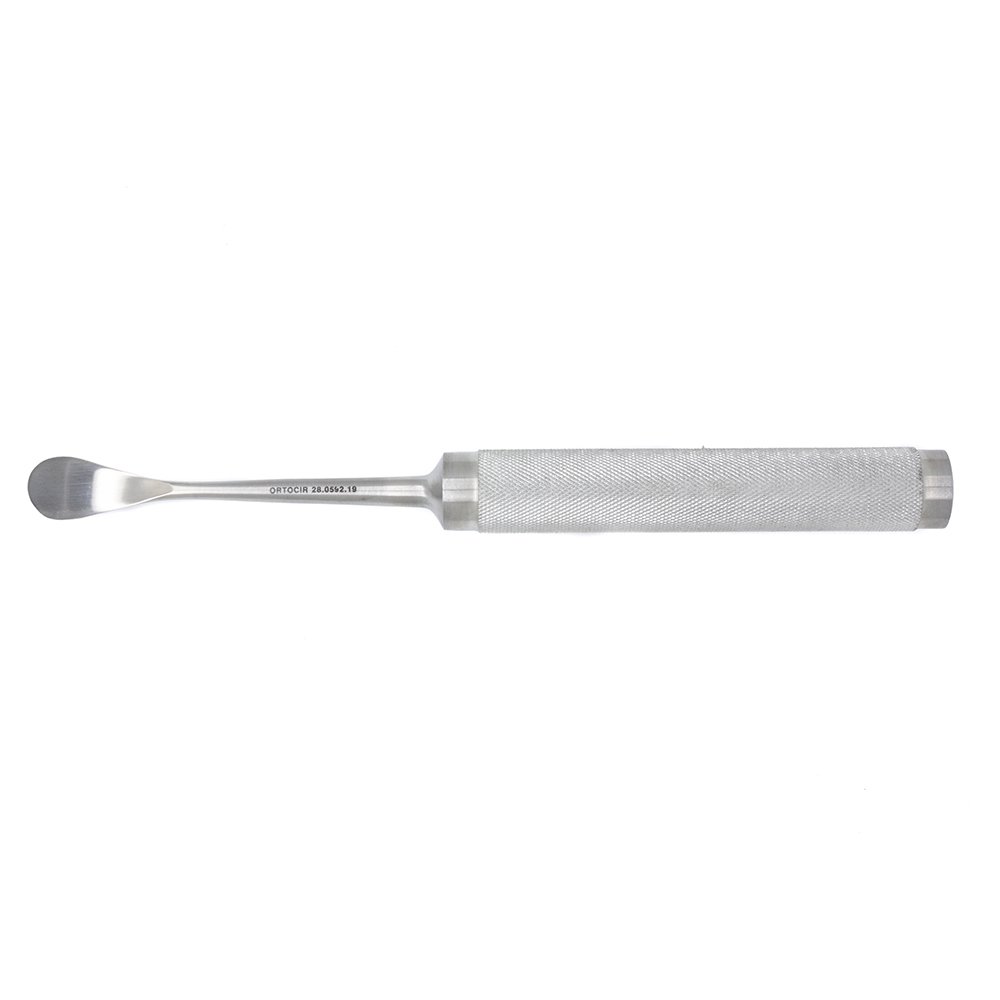 Essa rugina tem uma empunhadura estilo serrilhada e esse design minimiza a chance de o instrumento deslizar da mão do cirurgião.